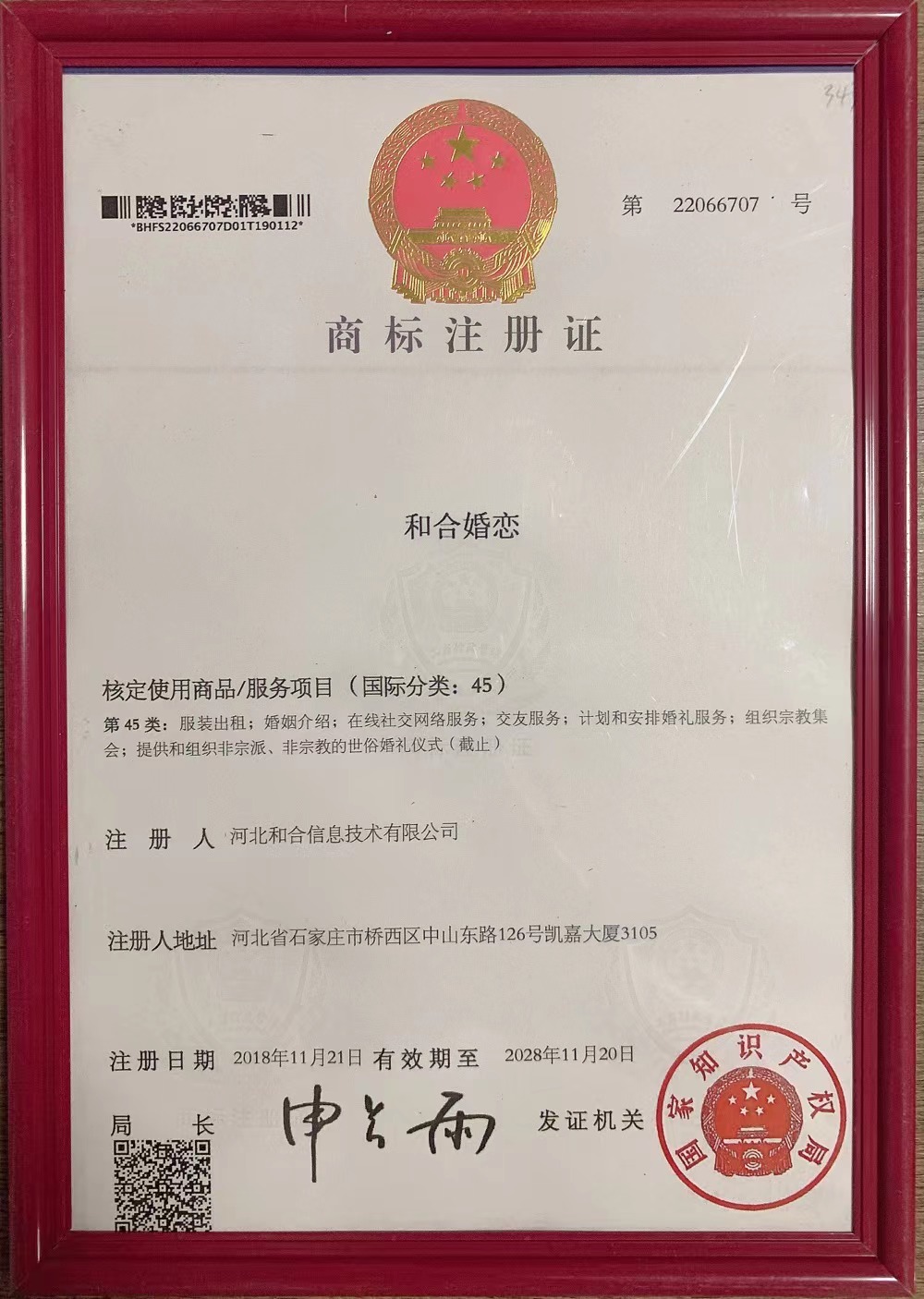 和合婚恋是国家注册商标,隶属于河北和合信息技术有限公司,该公司成立于2015年7月2日,注册资金500万,公司实力雄厚。